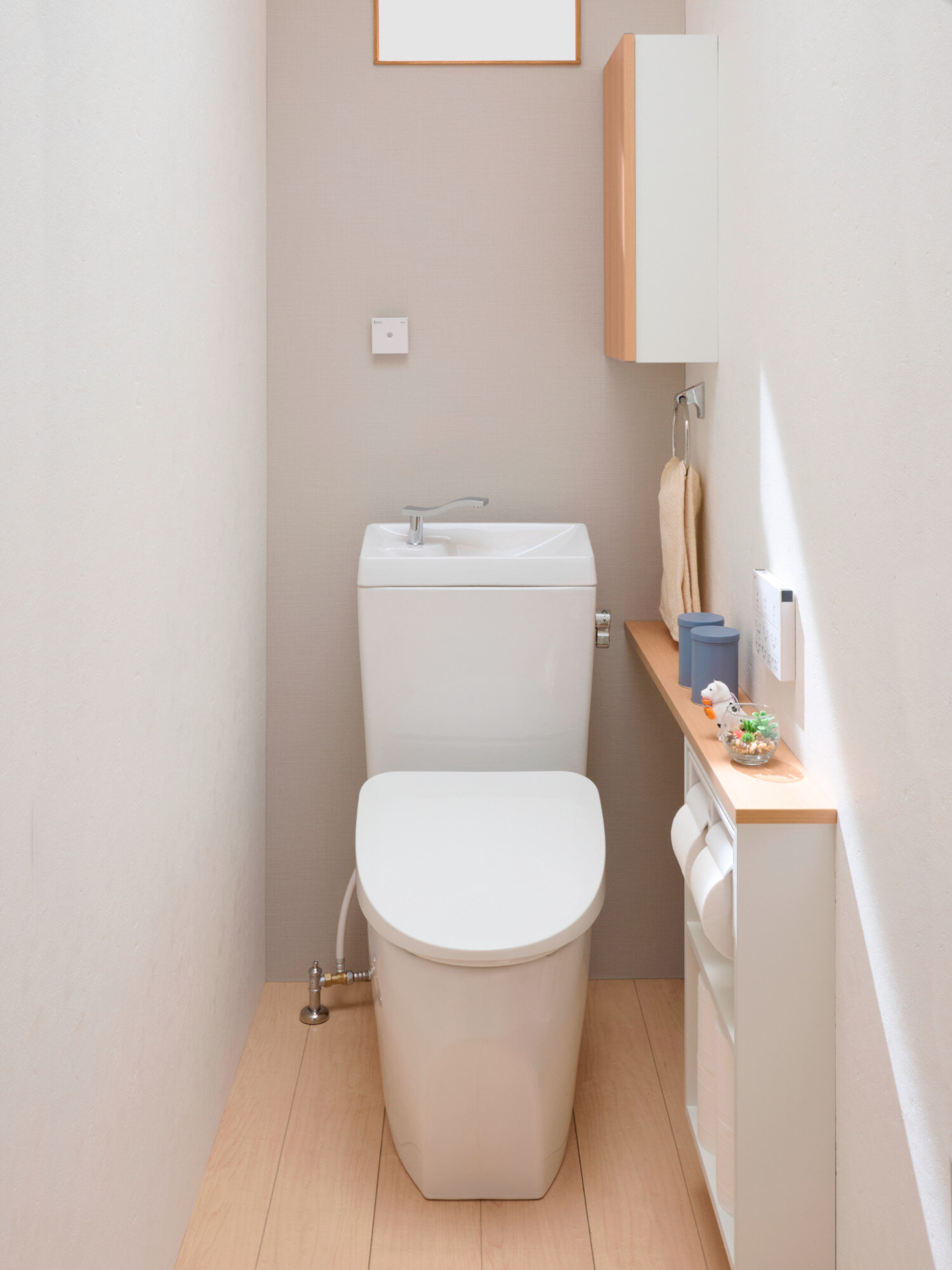 弊社ミドルグレードのタンク式トイレ「キュアーズ」シリーズ搭載便座としては、初のフルオート温水洗浄便座です。オート洗浄機能や、人が近づくと自動でふたが開くオート開閉機能、ふたを閉じた後に洗浄を行う便ふた閉止後洗浄機能を搭載しています。